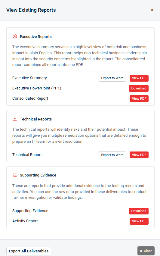 - To export all reports at once, click Export All Deliverables. You will be able to download a zipped folder containing all reports. The zipped folder contains PDF documents of all reports except Supporting Evidence. The Supporting Evidence report is available as a compressed zipped folder within the downloaded main compressed zipped folder.
