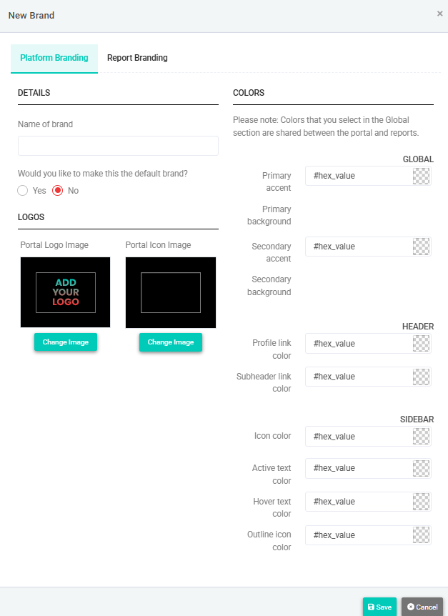 | Would you like to make this the default brand? | Select Yes to apply this brand to your portal upon saving. You can change the default brand any time. Refer to Changing the default brand. |