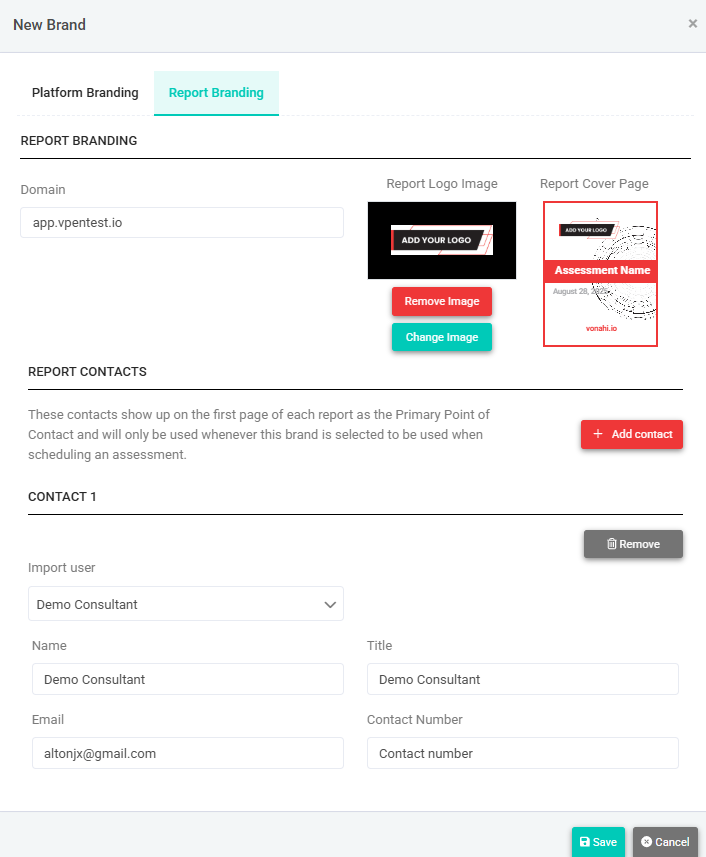 | Portal Logo Image | Enter the details for the contact(s) that appear(s) on the first page of the report when this report brand is selected for the assessment. To add multiple contacts, click Add Contact. From the Import User drop-down menu, select a user in the account to add as a contact. To remove a contact, click Remove. |