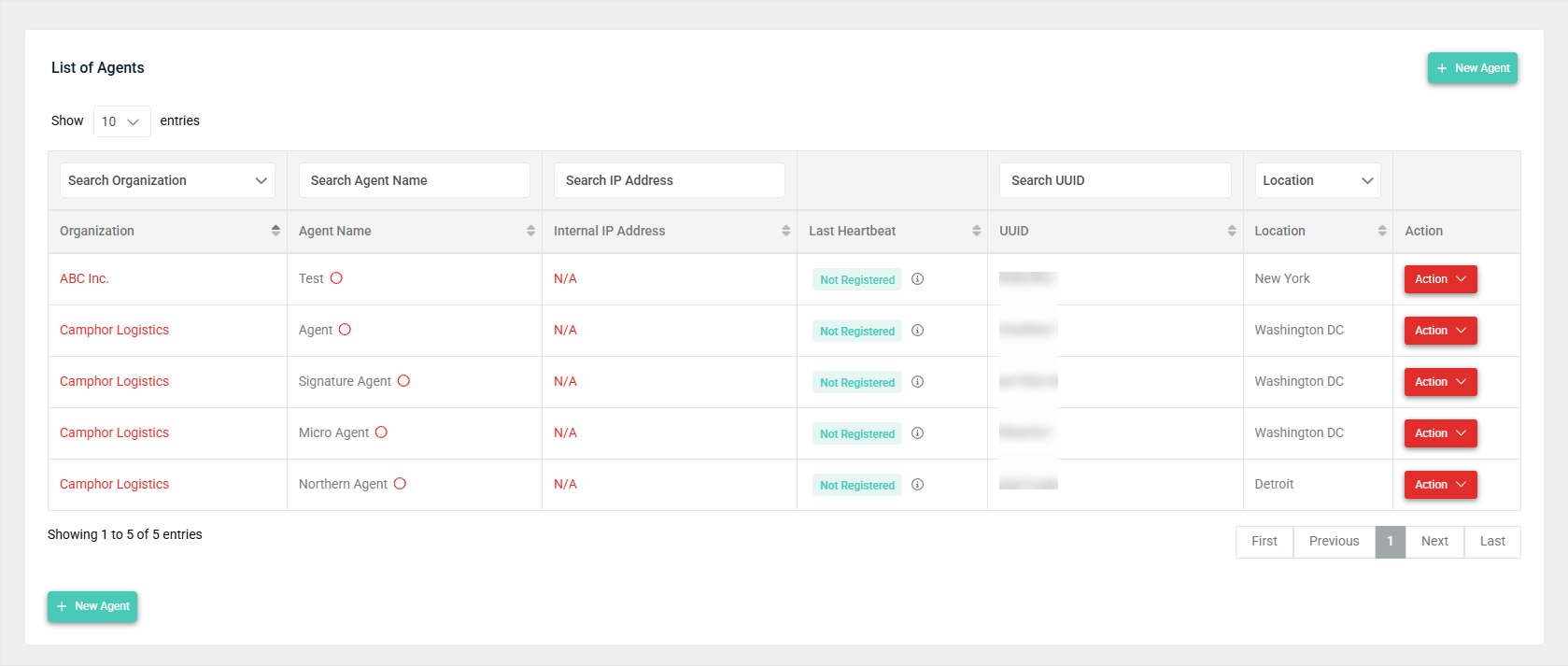 You have the option to search for specific agents in the list by name or IP address, select the number of entries displayed per page, and use the pagination controls to cycle through pages of entries.