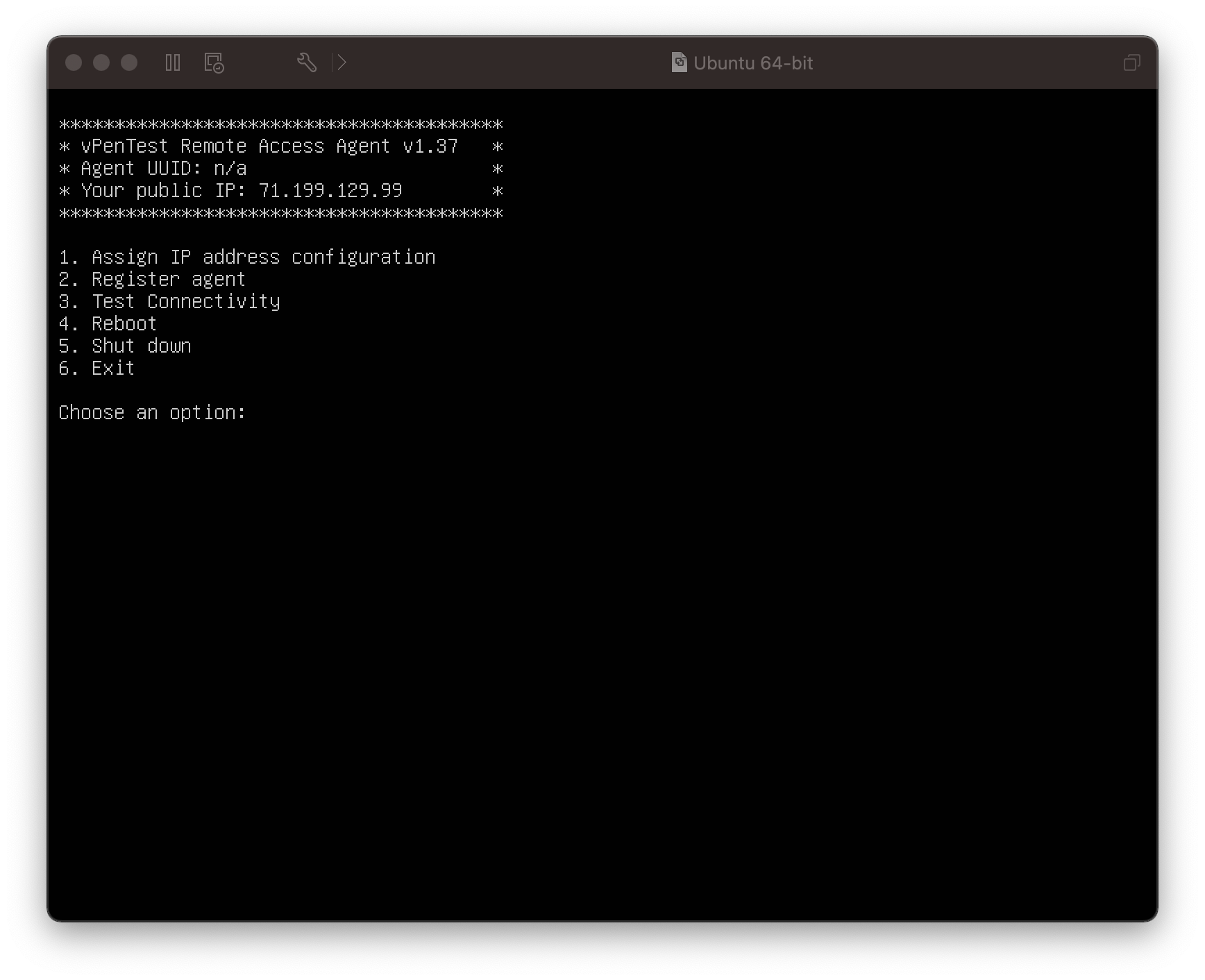 - Register your internal agent. Log in to your vPenTest agent, which should provide the vPenTest agent menu to you, as shown in the following screenshot: