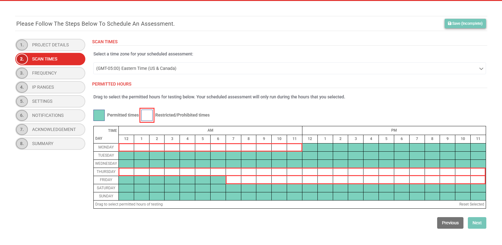 To restrict the assessment from running on a particular day (all hours), click the day to select all hours in the day at once. To restrict the schedule from running during specific blocks of time on certain days, click and drag as many hour slots as necessary. To remove any selected restrictions, click and drag your selections again to revert them.