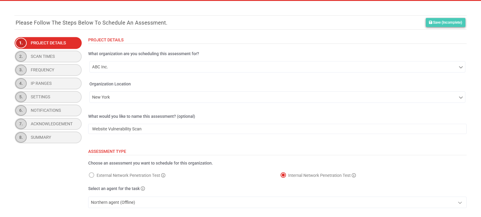 Scheduling an assessment is the process of configuring the necessary requirements for your client’s security assessment. Assessments are scheduled via the scheduling wizard, which prompts you to configure settings in a series of steps to ultimately produce assessment results and reports.