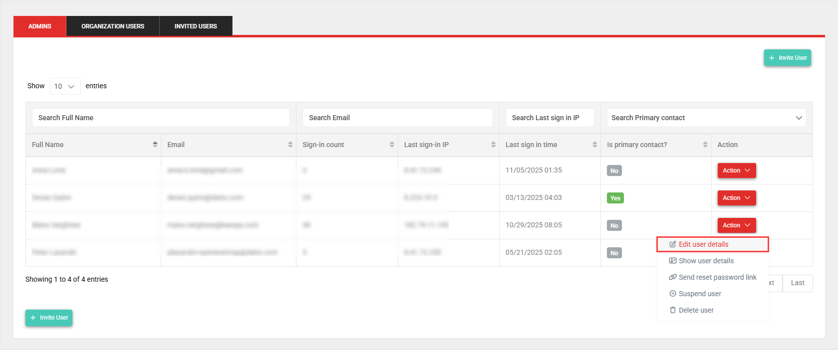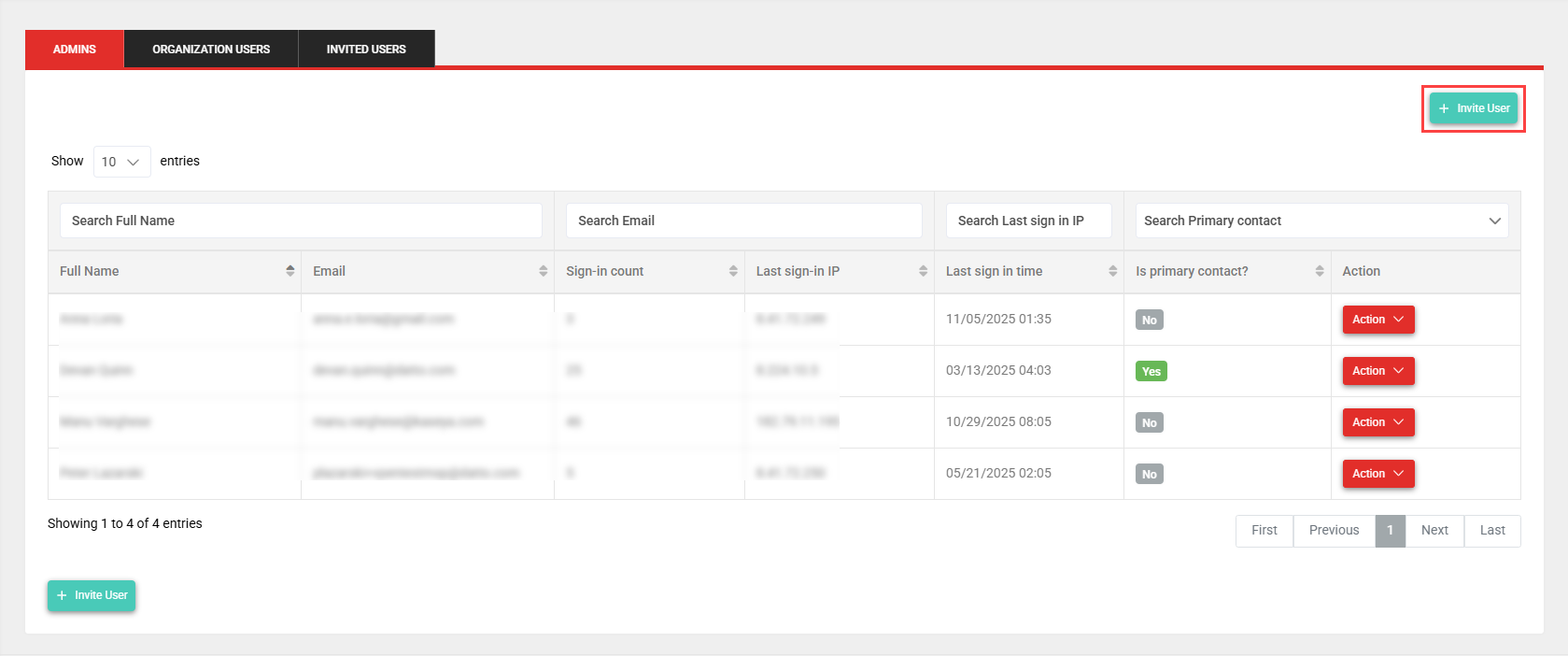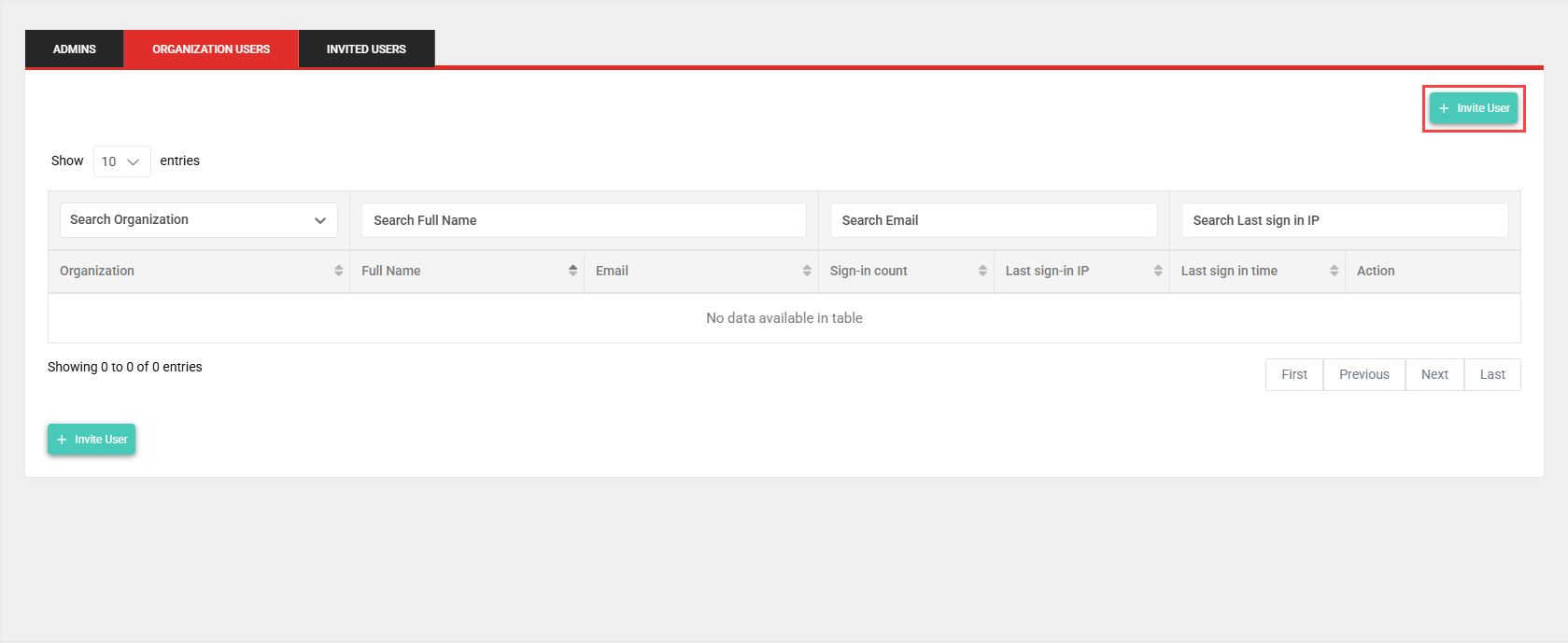 - In the Admins tab, selected by default, click Invite User.