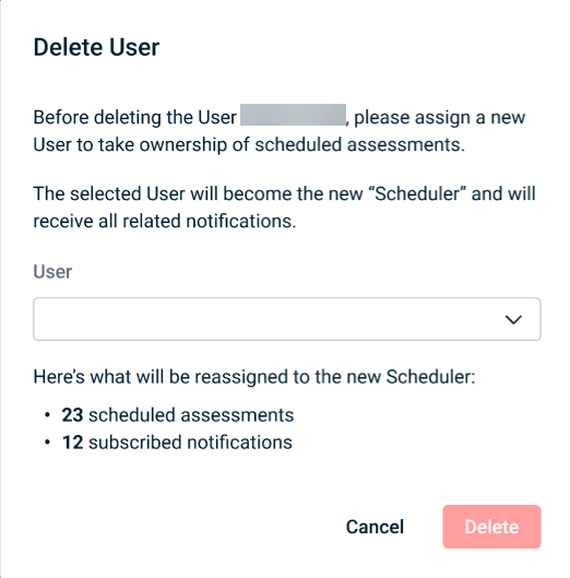 - If the user is associated with any currently scheduled assessments, you must select a different user from the User drop-down menu to take ownership of these scheduled assessments and receive the related notifications. This information is not displayed for users without scheduled assessments.