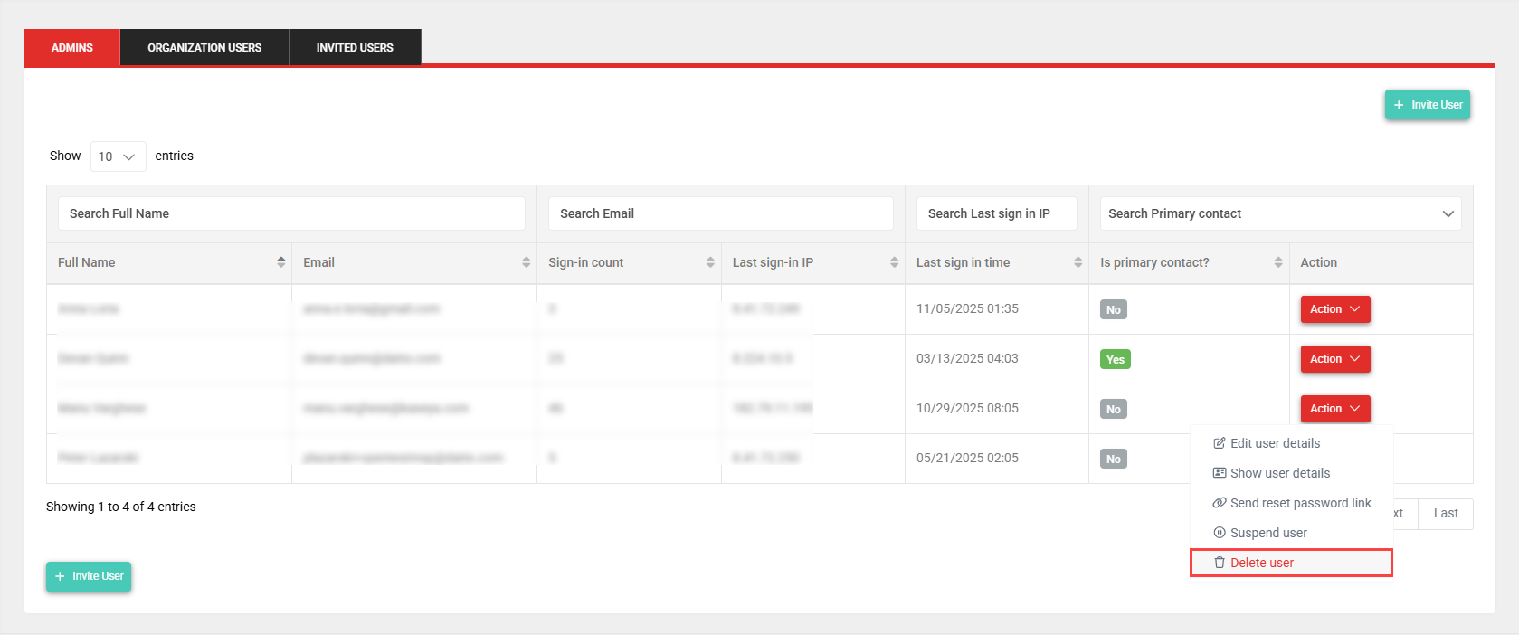 - In the Action column, click the Action drop-down menu for the user you want to delete and select Delete User.