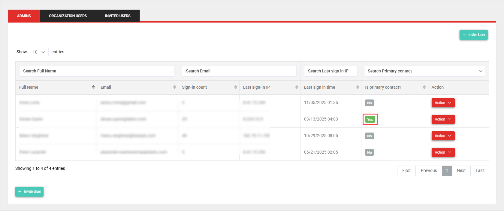 You can manage primary contacts by clicking Users in the left navigation menu to navigate to the Admins tab on the User List page.