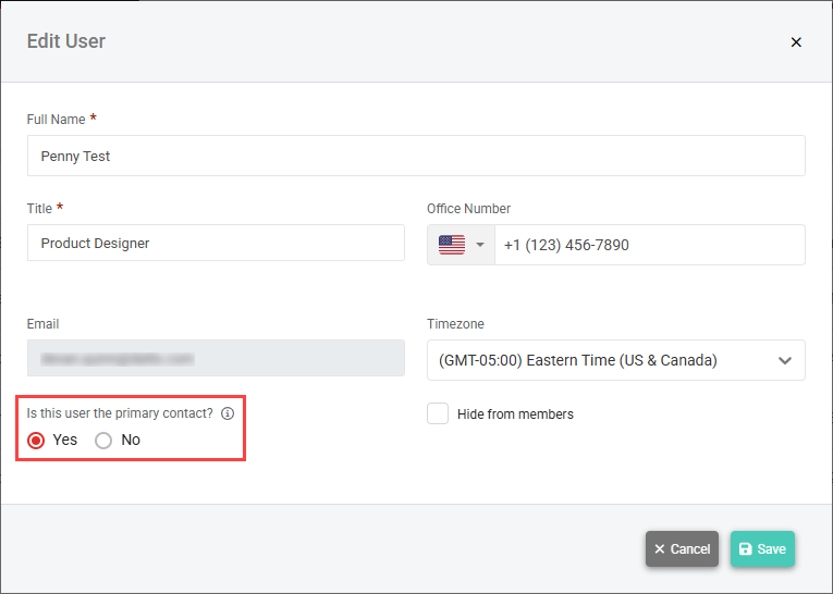 - In the Is this user the primary contact? field, select Yes or No to make this user a primary contact or remove this user as a primary contact, respectively.