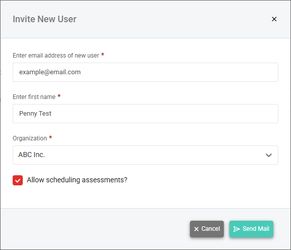 - In the Invite New User window, enter the email address and first name of the user you are inviting to the portal. After account creation, the user will be automatically added to the organization you selected on the List of Organizations page.