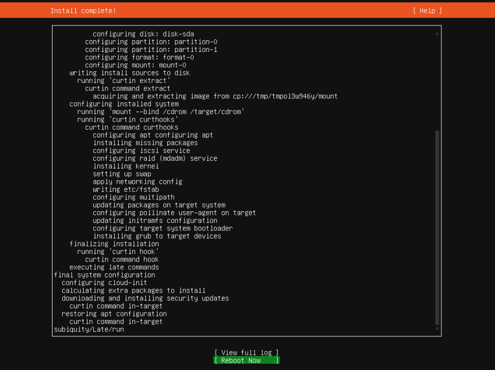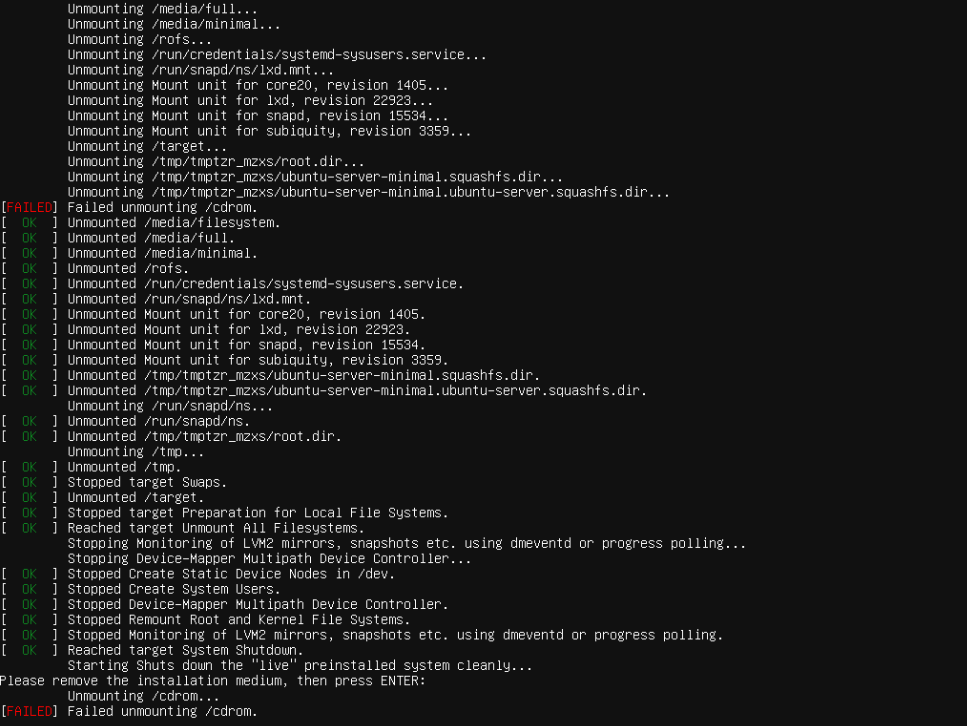 - Reboot once the installation completes. If you get the error message Failed unmounting /cdrom, press Enter to progress the reboot.