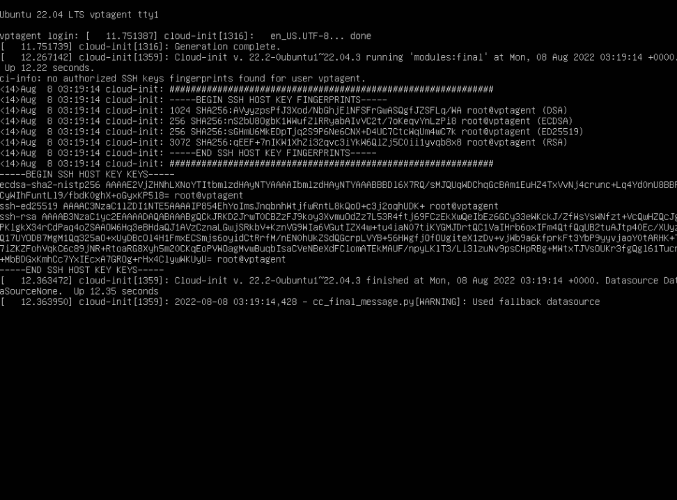 - Once Ubuntu boots, you will see the login screen followed with some cloud-init data. Press Enter to get to the login prompt.