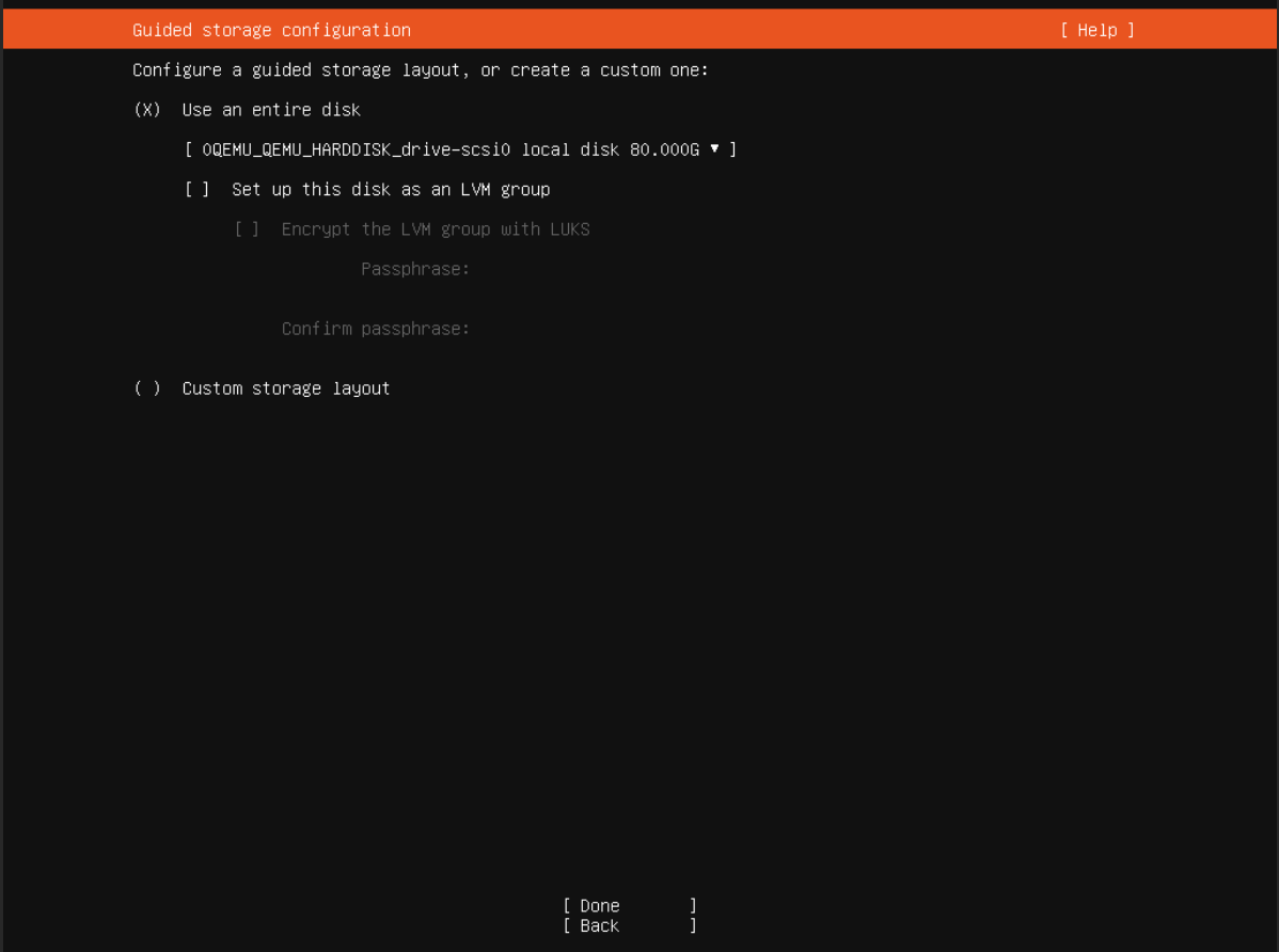 - Guided storage configuration: Clear the Set up this disk as an LVM group option.