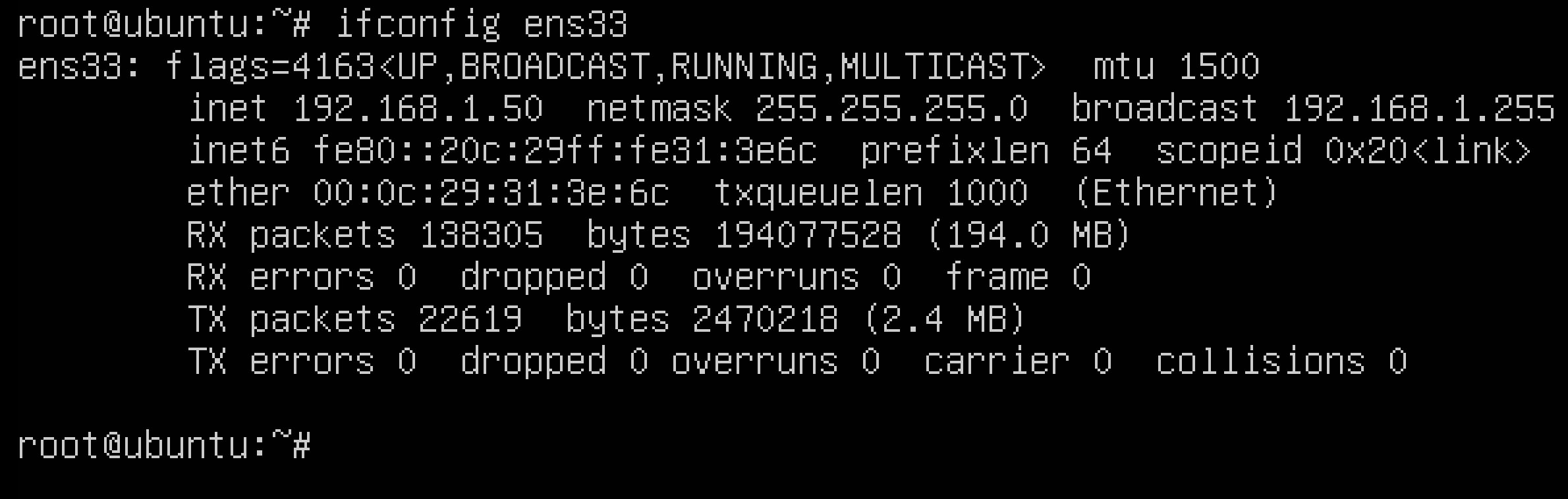 To verify your IP address configurations per the previous settings, run the ifconfig again. As you can see below, the IP address configurations were successfully saved:
