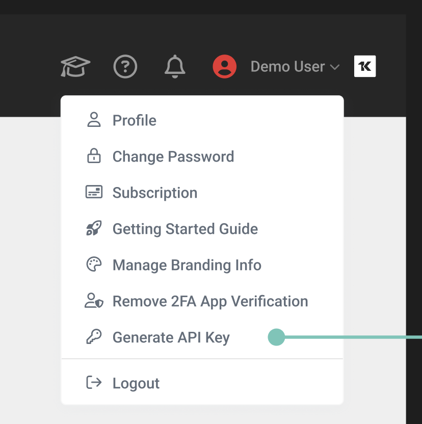 - From your profile drop-down menu in the upper-right corner of the header, click Generate API Key.