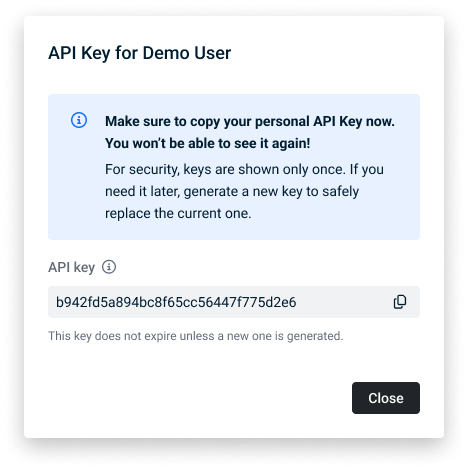 - Be sure to copy your generated API key, which is displayed here only once. You can generate an API key any time to safely replace the existing one.