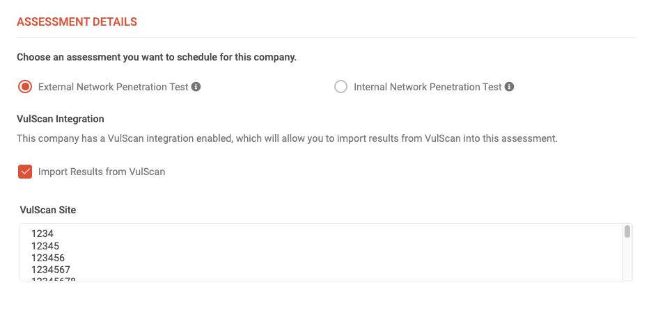 Once the integration is enabled and organizations are mapped, you will be able to import scan results from VulScan into a new assessment in the Scheduling Wizard for the following: