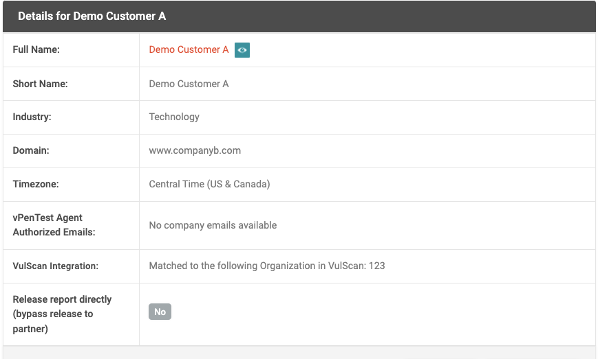 If an organization in vPenTest is mapped with a VulScan organization, its profile page will show the following details.