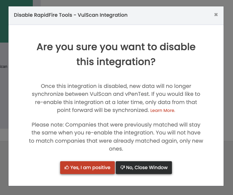 When the integration is disabled, the below confirm modal will be visible and upon confirmation, the integration will be disabled.