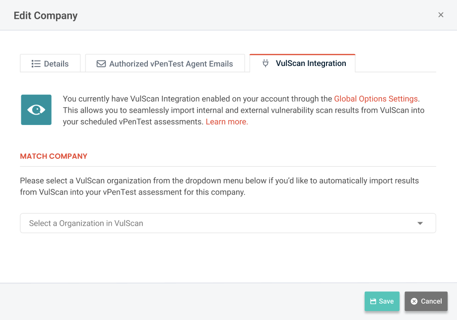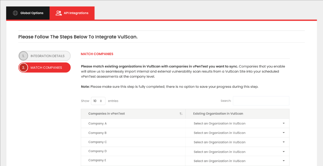 - This step lists all the companies available in the vPenTest portal for the logged in user and a dropdown that takes all organizations available in VulScan to be mapped with the vPenTest organization.