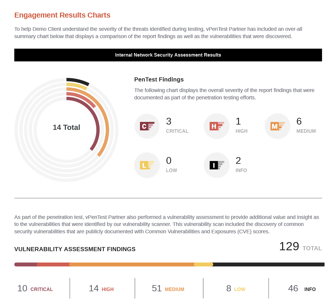 Upon completion of a scheduled internal or external network penetration test, you'll receive a summary email notification with a summary of the results from VulScan and vPenTest like the following example.