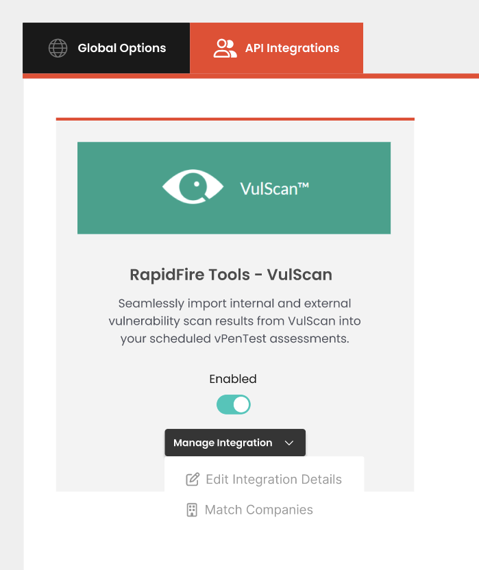 - To turn this integration on, you will need a Vulscan API key and this is retrieved from the Rapid Fire Tools portal in the Global Settings > API Keys page.