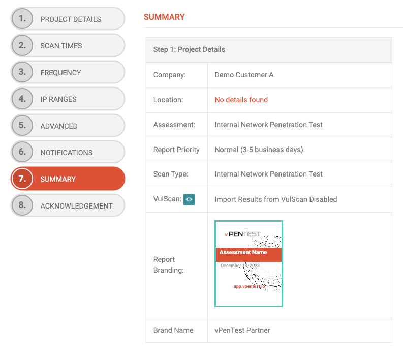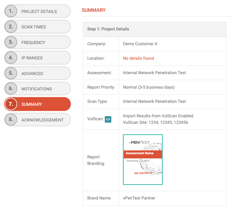 - In Step 6 of the Scheduling Wizard, details of the VulScan integration will show up on the Summary page under Step 1: Project Details.