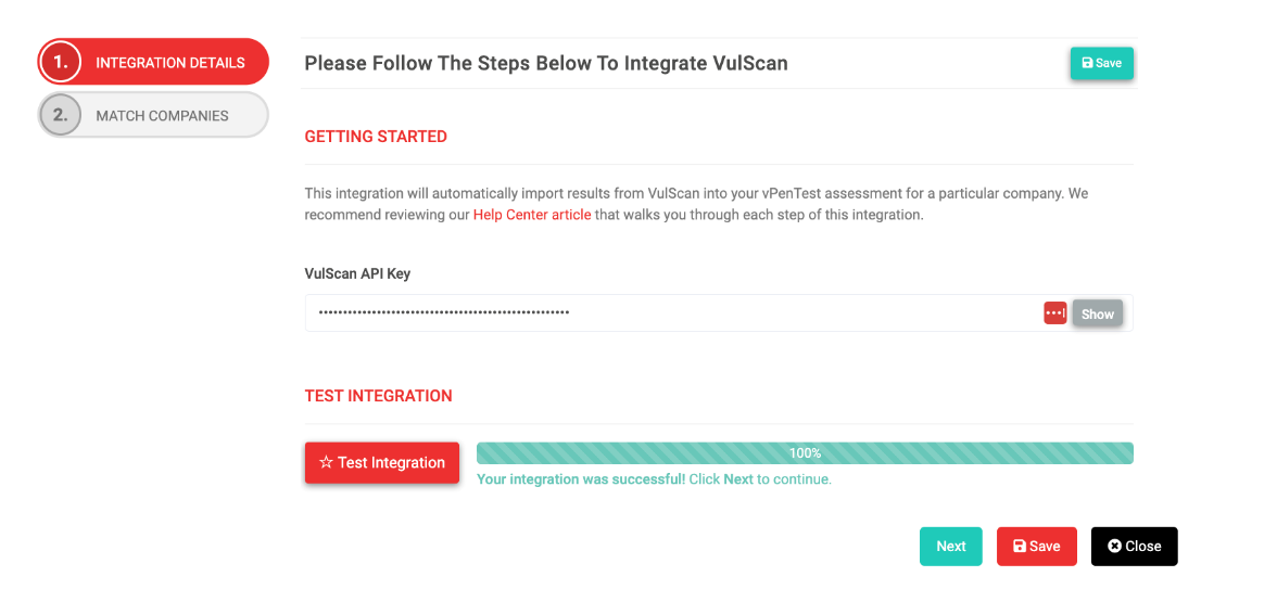 - Upon enabling the integration, a two-step form will be presented. The first step takes the credentials to fetch the details from the Vulscan portal. All details are required, and you can hit the save or close button at any stage if the integration is not supposed to be completed at that time.