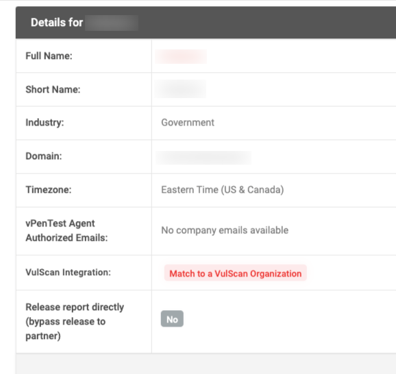 If an organization is not mapped with a VulScan organization and the VulScan integration is enabled, a button that says Match to a VulScan Organization will be visible on the organization profile page.