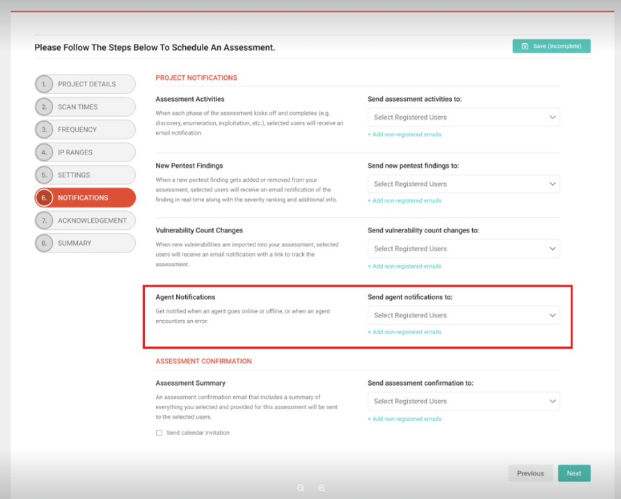 Step 6 (Notifications) of the scheduling wizard now includes an Agent Notifications section for internal assessments that require an agent.