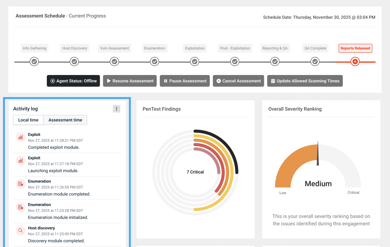 You can now switch between your local time zone and the assessment’s time zone when viewing activity logs. This makes it easier to compare assessment activity with alert logs and ensures you always have the right context for your investigations.