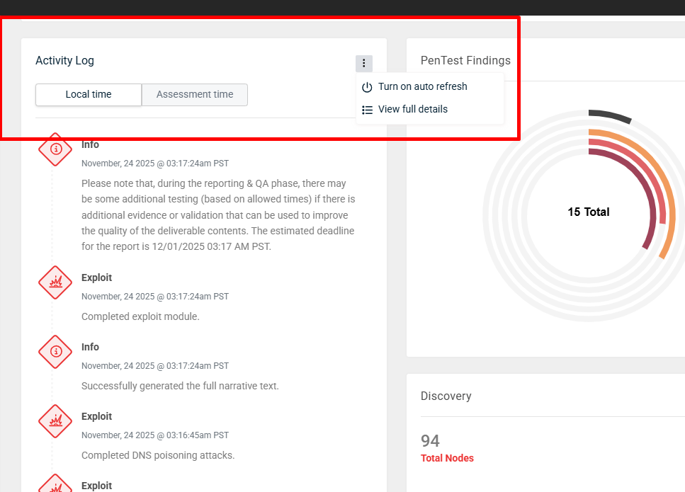 You can now switch between your local timezone and the assessment's timezone when viewing activity logs. This makes it easier to compare assessment activity with alert logs and ensures you consistently have the right context for your investigations.