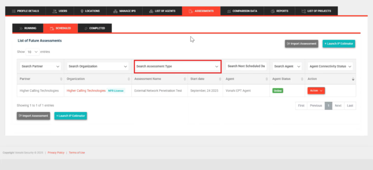 Scheduled and Completed Tabs: Renamed Search Assessment to Search Assessment Type to better reflect options in the filter.