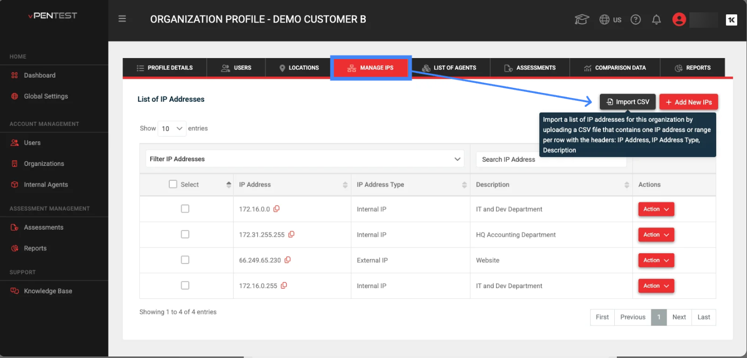 We’ve made it easier for MSP partners and MME company users to manage large sets of IP addresses! You can now bulk import IPs directly from a CSV file in the “Manage IPs” tab of the Organization Profile page. This enhancement streamlines the process of adding multiple IPs, including their types and descriptions, all in one go—no more manual entry or repetitive updates.