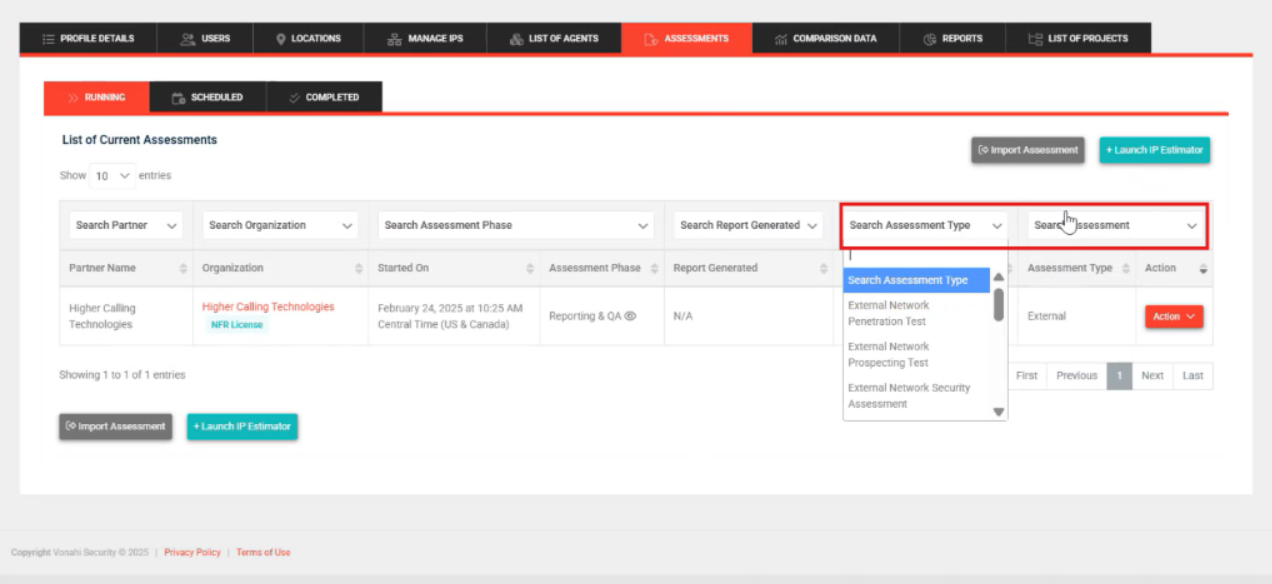 Scheduled and Completed Tabs: Renamed Search Assessment to Search Assessment Type to better reflect options in the filter.