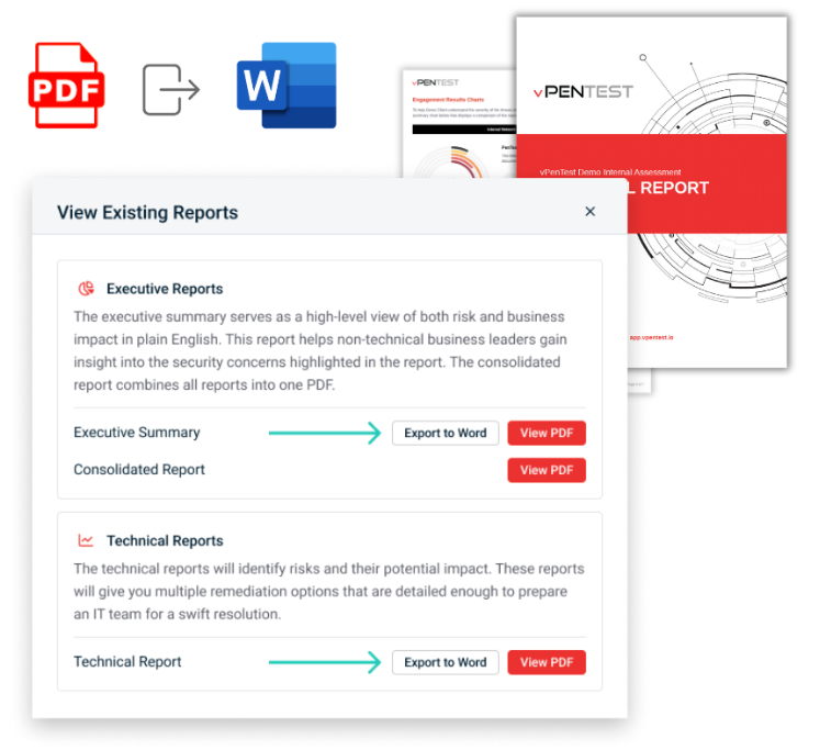 We’re excited to introduce a new feature that empowers our MSP partners by providing the ability to export their pentest reports as Word documents (DOCX). This feature allows partners who have custom branding enabled to further personalize their reports by making additional edits and tailoring them to meet their specific client needs.